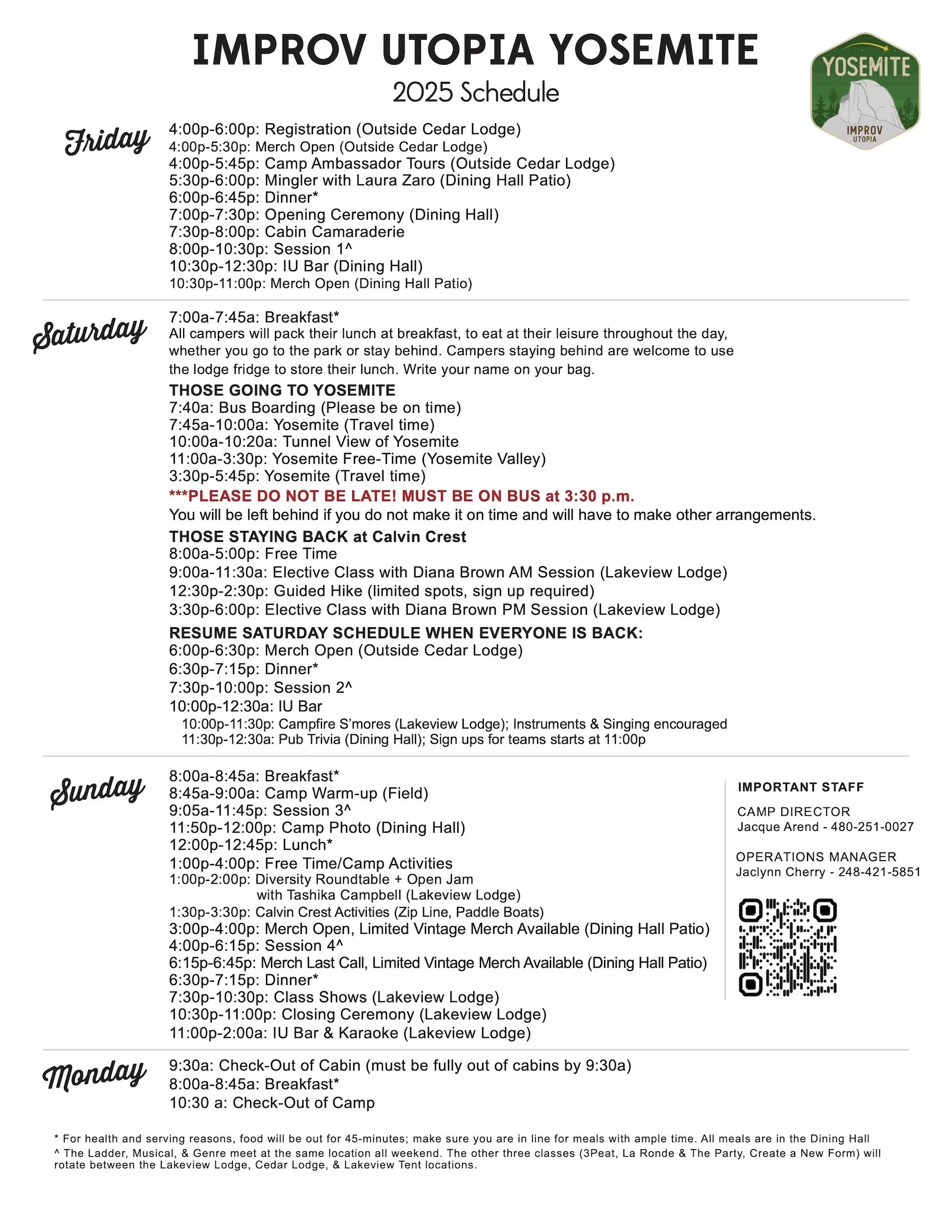 More free time activities may be added through out the weekend. Our Yosemite Camp and Camp Calvin Crest are an incredible place for rest and relaxation so don’t hesitate to enjoy the respite during free time!